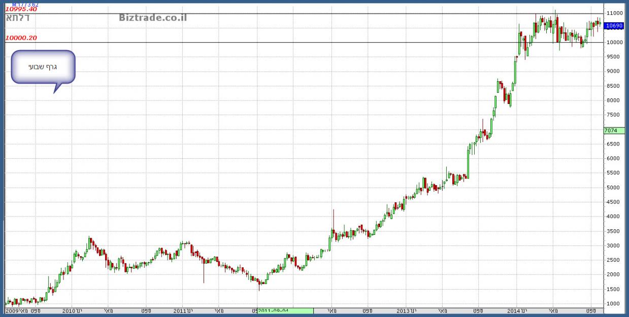 מובא צילום של גרף שבועי בו ניתן לראות את הדשדוש הארוך טווח של כ 1000 נק" בלבד, כאשר הוא נע בין ה 10000 --