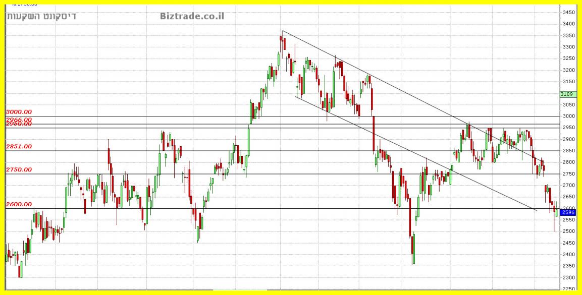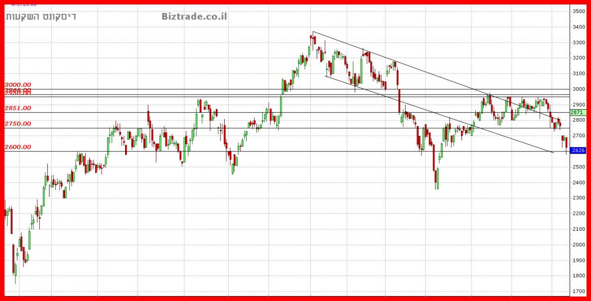 כרגע המחיר נמצא סביב הקו תעלה יורד -- קו תחתון אבל !! מתחת לקו אופקי ב 2600 , שהוא בהחלט קו טכני חשוב באזור .