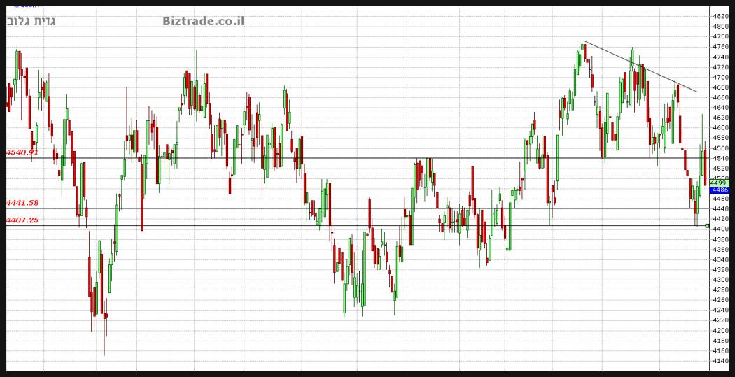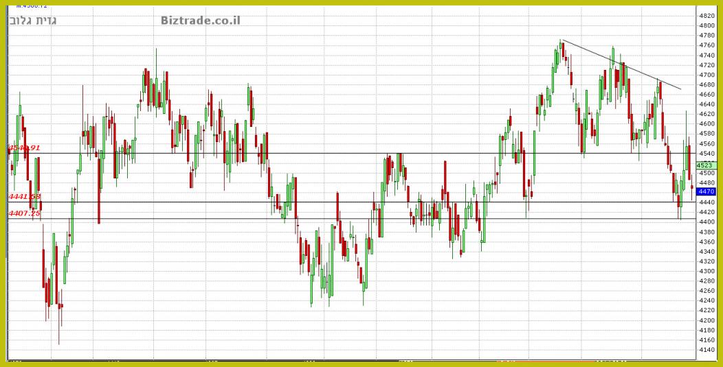 יורדת השבוע ל 4400 , יוצרת היפוך ביומי , עולה 3 ימי מסחר מאוד יפה, וסוגרת את השבוע באופן שלילי חזרה ב 4486.
