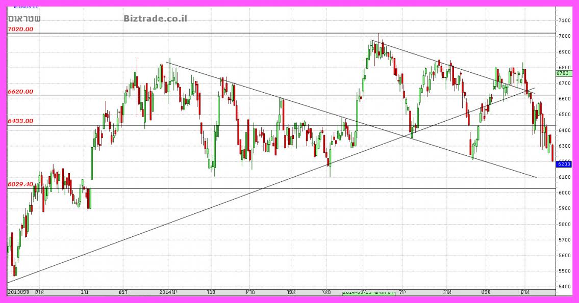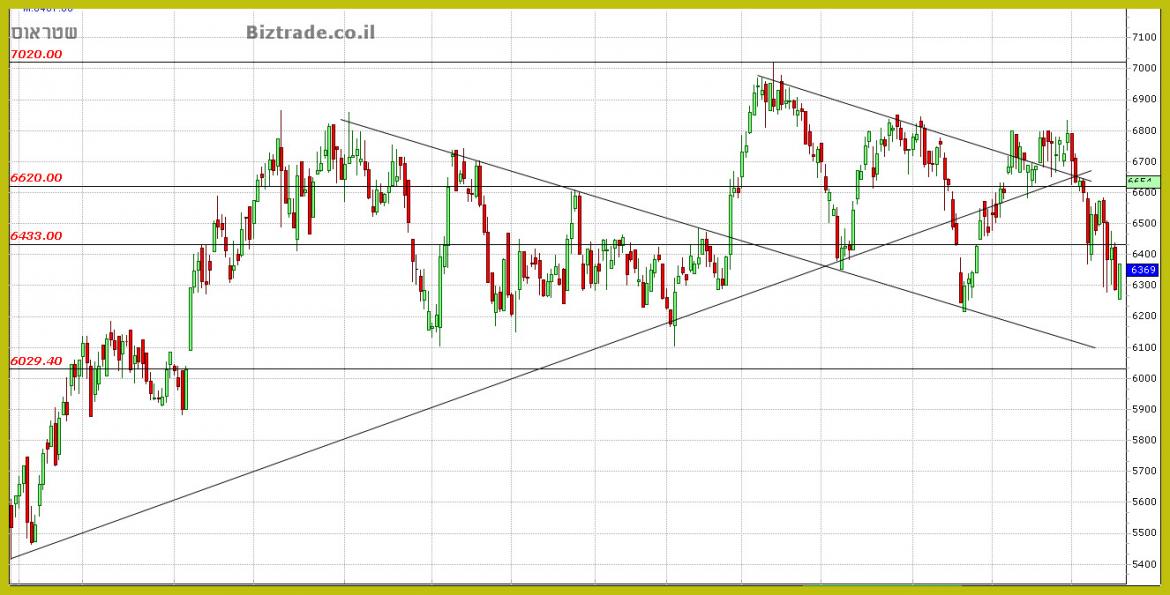 הגרף מאוד מחובר לעדכון של סופ"ש, ורמת ה 6300 נשברה, וכרגע המחיר בדרכו לקו ה 6100 -- 6000.