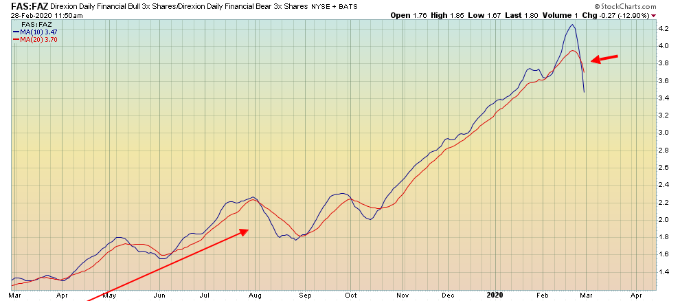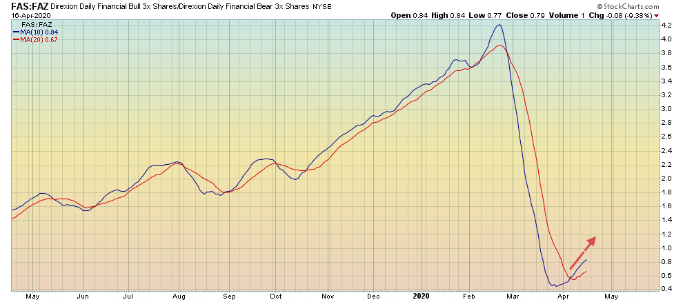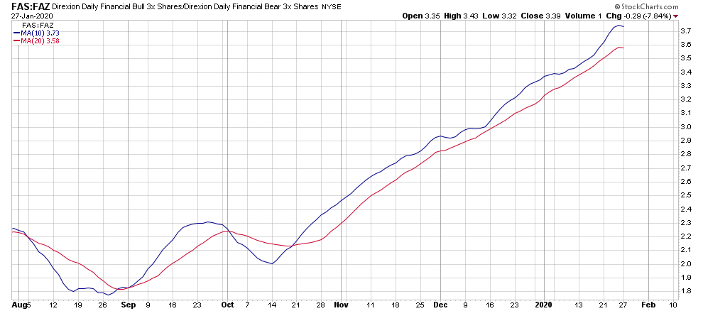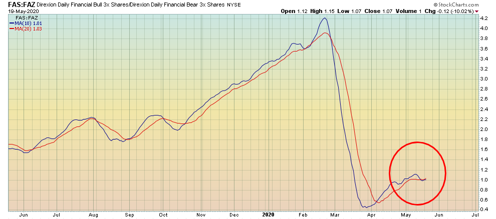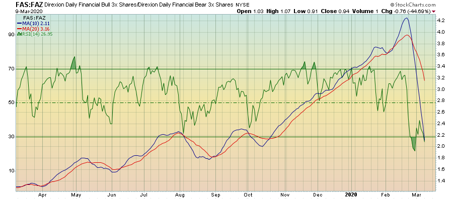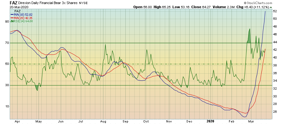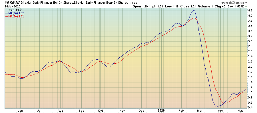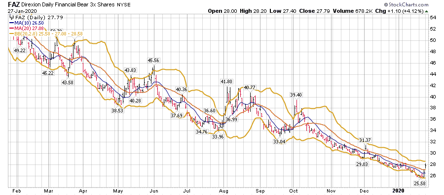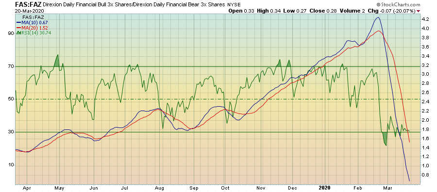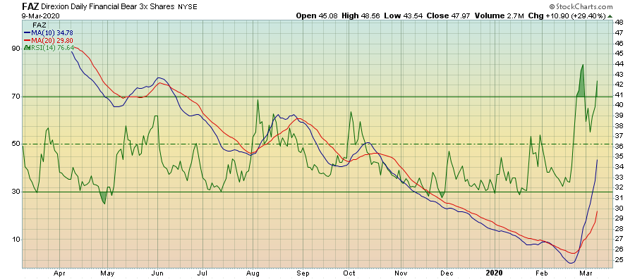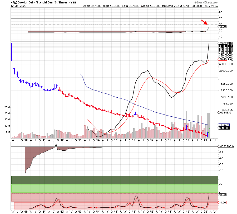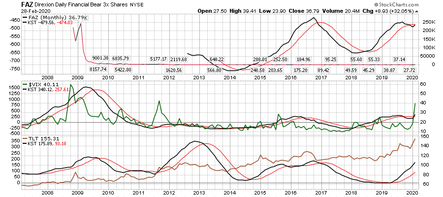 מבט על תעודת השורט FAZ על טווח של מספר שנים מתקבלת תמונה של תחילת צמיחה לאחר שנים רבות של תנועה בתוך איזור המכירת יתר. הסטוקסטי החודשי מראה יציאה מתחום ה-20%.