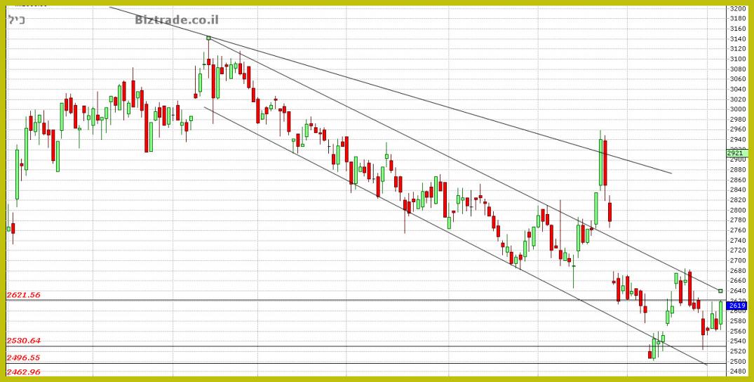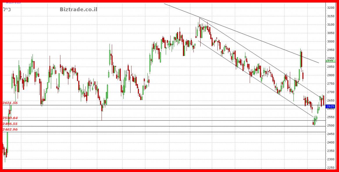 כול היום הייתה חיובית, אבל קשה לה לברוח מהטכני שלה כי הוא ממשיך להיות שלילי , והצפי כפי שכבר נכתב הוא המשך ירידות, כאשר את האישור לכך נתן אתמול קו ה 2620 שנשבר מטה.