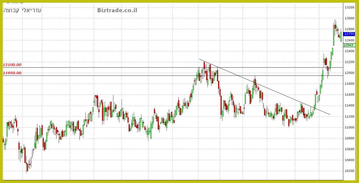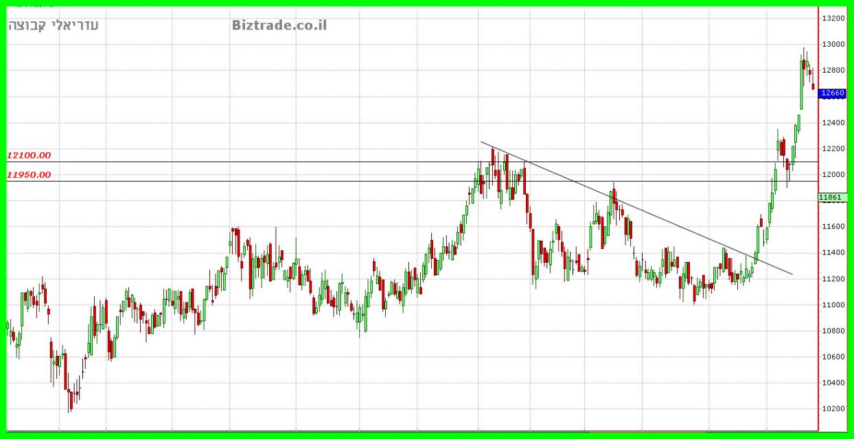 קו המגן של הגרף נמצא ב 12100 , כך שכול עוד המחיר נסחר מעליו = סיכוי לעליות.