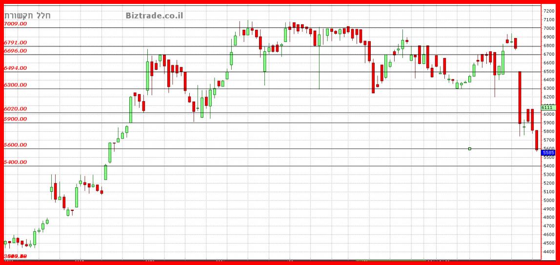 תנאי עצירת הירידות וסיכוי לעליות היה שמירה על קו 5800 , ומה פתיחה זה כבר לא נשמר, על כן המחיר יורד ושובר גם תמיכה נוספת ב 5600