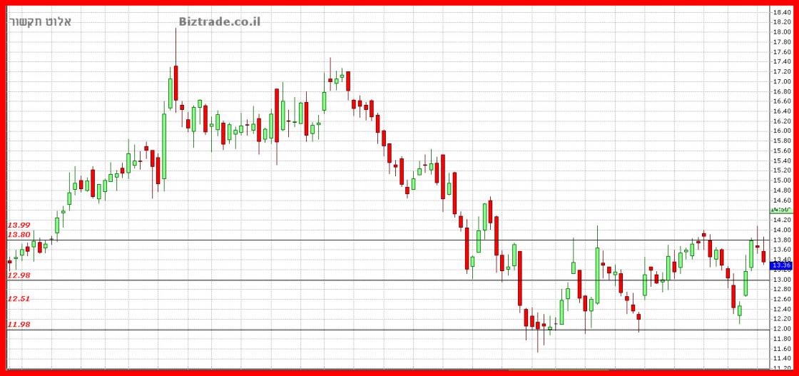 הגרף אשר נמצא בדשדוש ברור בטווחים שבין 12$ , 13.80$ , עוצר בקו ביניים ב 13$ ביום המסחר האחרון.