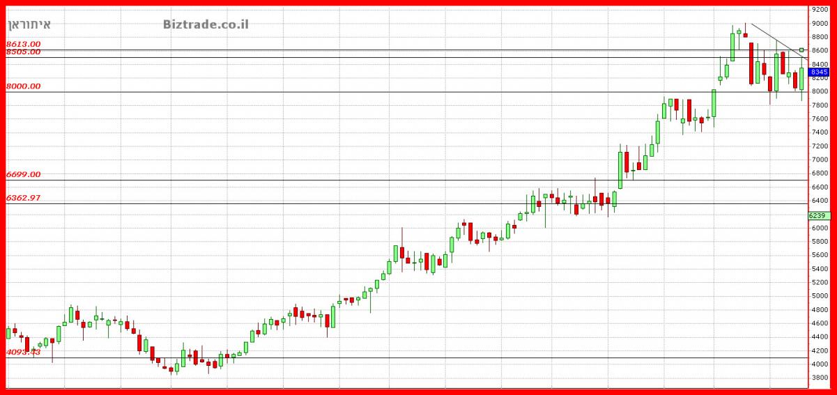 המחיר עולה בחדות מעל ה8000 , עם סגירה בו ביום ב 8340 ! ולמחרת נר אדום אשר מוצא התנגדות ברורה בינתיים בקו מגמה יורד , אשר ממוקם ב 8500 יחד עם קו אופקי.