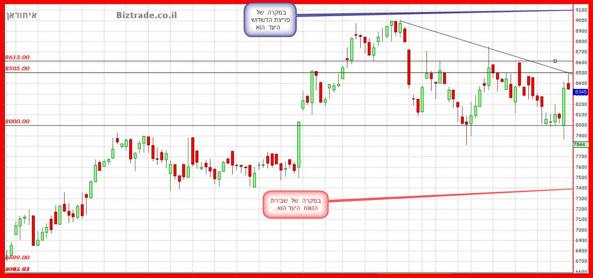אי פריצה של ה8500 = חזרה מטה, עדיין בתוך הטווח. כאשר כול יציאה מהטווח , תשלח את המחיר 600 נק" לכול כיוון.