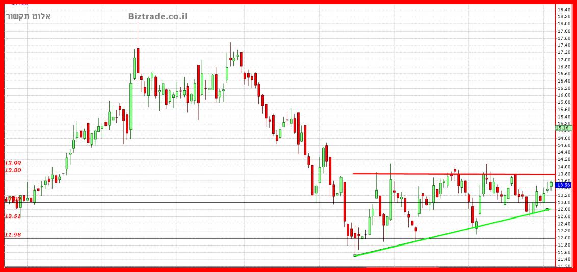 אלוט מטיילת לה באופן חיובי וללא כוחות לפריצה עדיין לקו ה 13.8$, אבל אני מתחיל לראות שזה לא לעוד הרבה זמן, מהסיבה שהגרף מתכונן לפריצה , והשפלים העולים המחוברים כרגע על ידי קו מגמה בתוך הדשדוש , מגלים זאת.