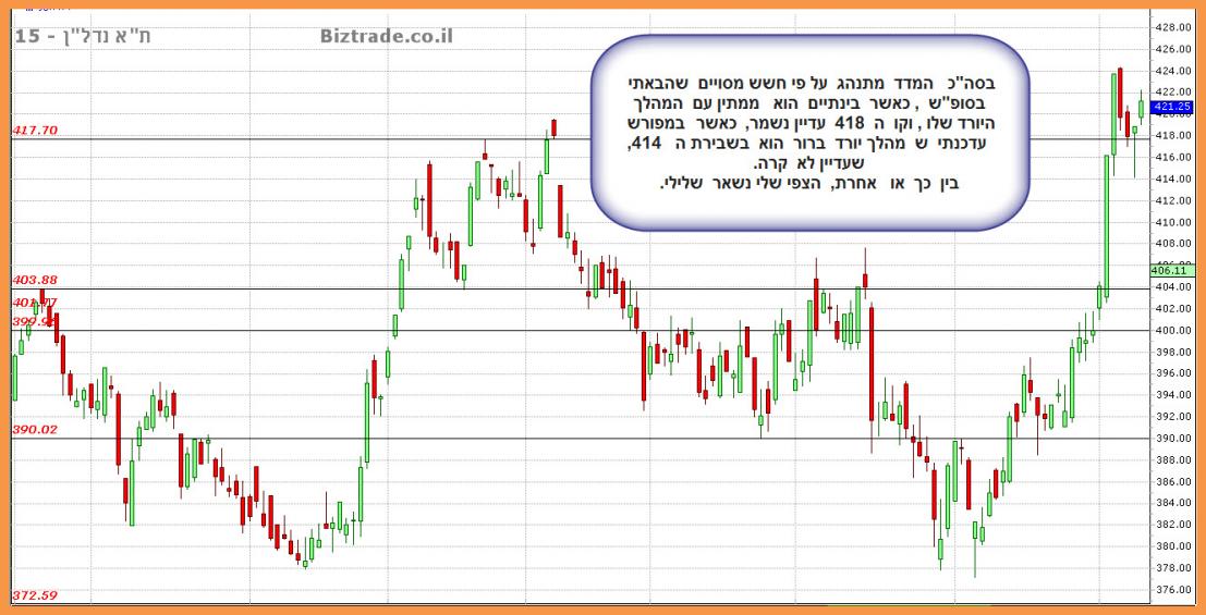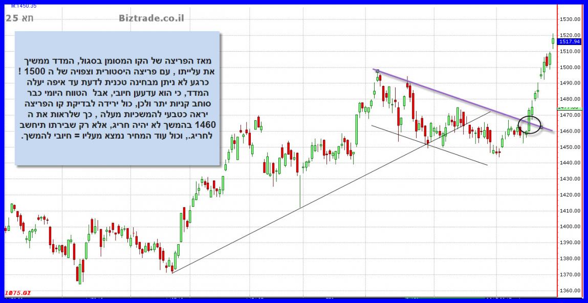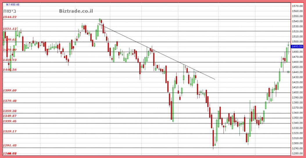 המדד מגיע לשער חשוב - 1500 ויוצר נר יפני לבלימה. בלימה כזו על קו כל כך חשוב ב-1500, מרמז על כוונותיהם של המוכרים ויכול לסמן היפוך מטה מכאן. על כן נלך כאן לגזרה והיא: פריצה של 1500 = 1520-1540, שבירה של 1480= 1460-1440.