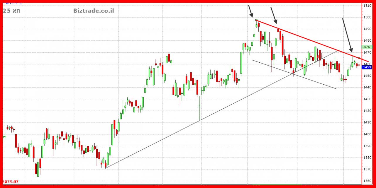 ביום רביעי האחרון המדד נותן איתות חיובי נוסף ושני , כאשר הוא סוגר מעל ה 1250. וביום ה האחרון המדד מצליח גם לסגור מעל הקו הבא ב 1260 , שפרט לקו התנגדות אופקי זהו גם תיקון פיבו ראשון על כול המהלך היורד וסגירה זו מעל הקו צפויה לשלוח את מחיר לקו פיבו הבא ב 1285.