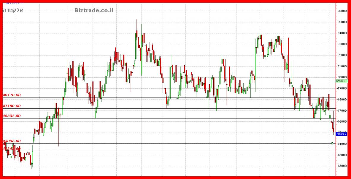 למרות השבירה החשובה מבחינה טכנית, איני רואה כרגע המשך ירידות שיובילו מעבר ל 44000 --- 43340. כך שבקרוב גם הגרף היומי וגם השבועי צפויים לדרוש תיקון עולה וכאשר הוא יצא לדרך נוכל לדעת עד לאן.