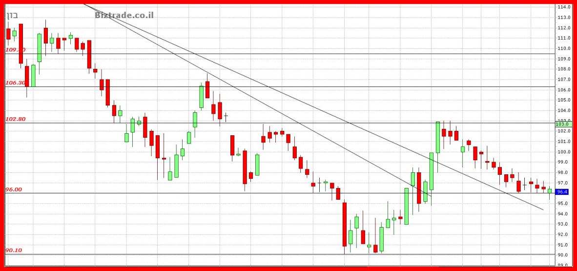 המחיר ממשיך לשמור על קו ה96, , ואתמול למרות ירידתו אל ה 95.4 , המחיר חוזר מעלה וסוגר מעל ה 96. ,