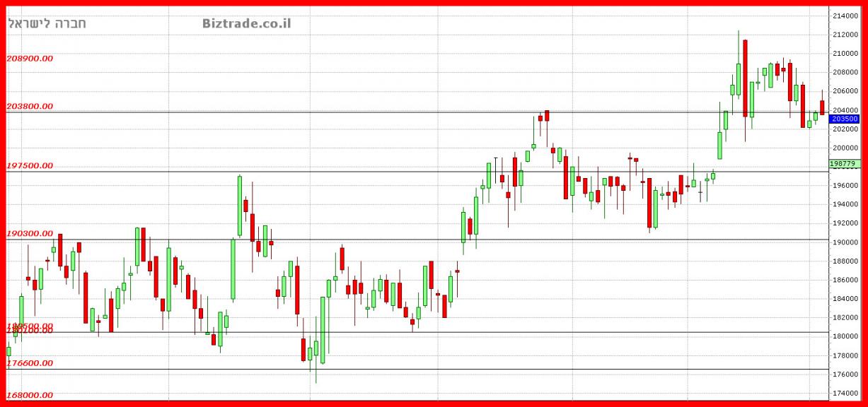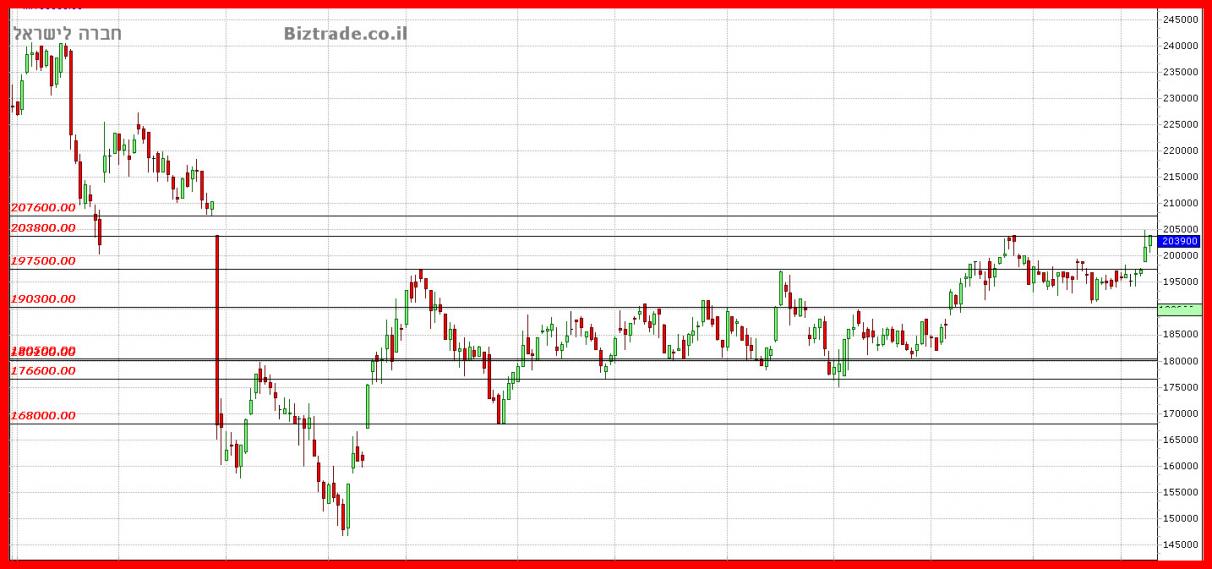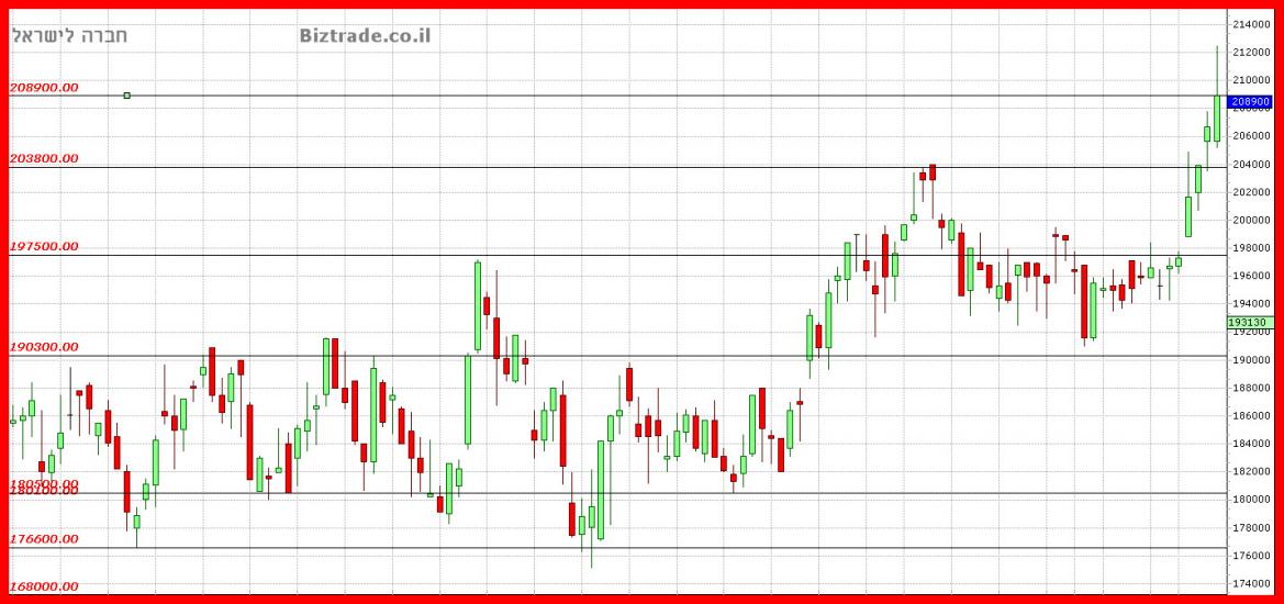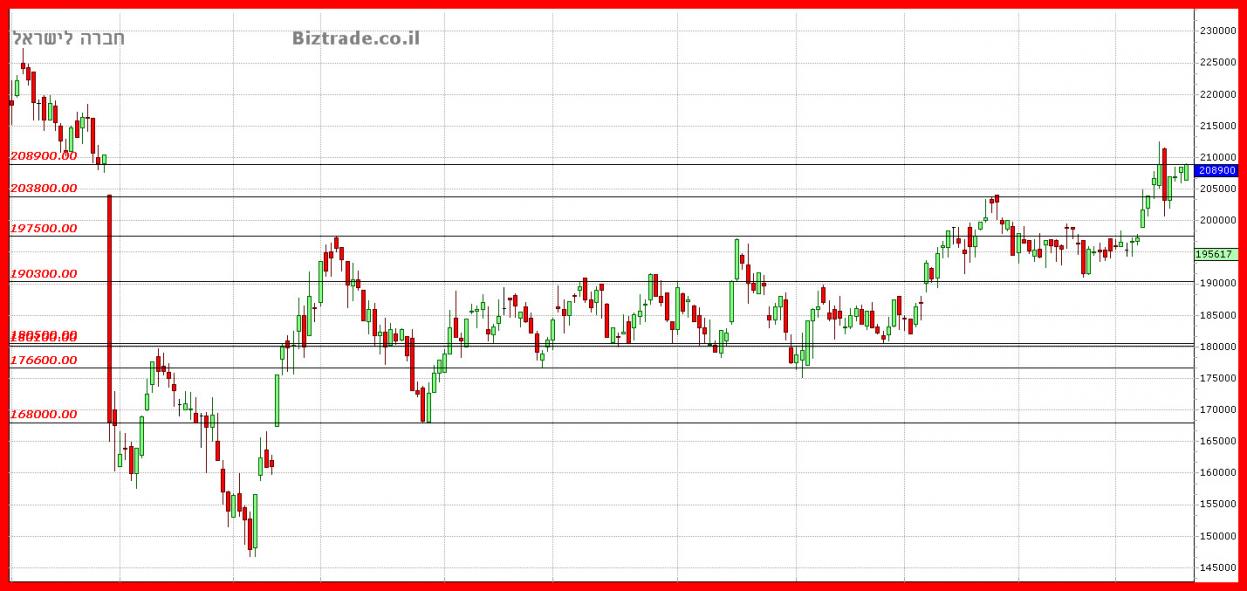 אכן הגרף המשיך את העליות כצפוי מהעדכונים ונעצר ( לאחר שעבר בתוך יומי ) בקו הטכני שניתן כיעד והוא 208900, וזה גם מחיר הסגירה.
