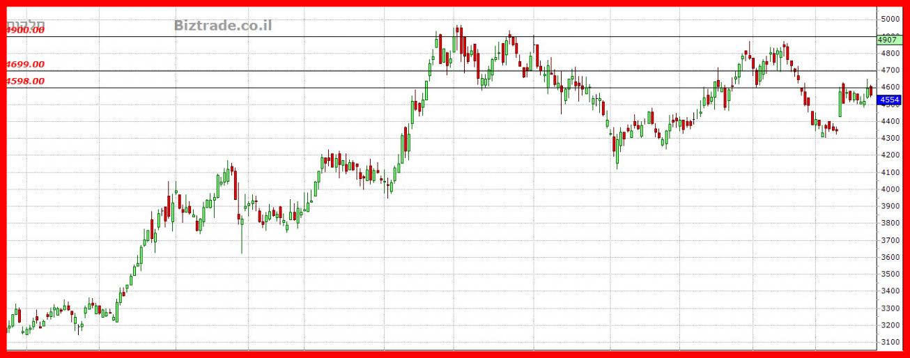 לא שברה את קו ה 4500 במשך 7 ימי עבודה ובכך יוצת היום לעליות תוך יומיות כאשר בינתיים המחיר מעל ה 4600,