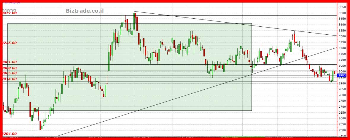 עדיין שומרת על קו ה 2900 , כפי שהתבקש בעדכון השבועי, כך שסיכויי העליות עדיין כאן , ופריצת ה3000 , יכולים להביא לכך.
