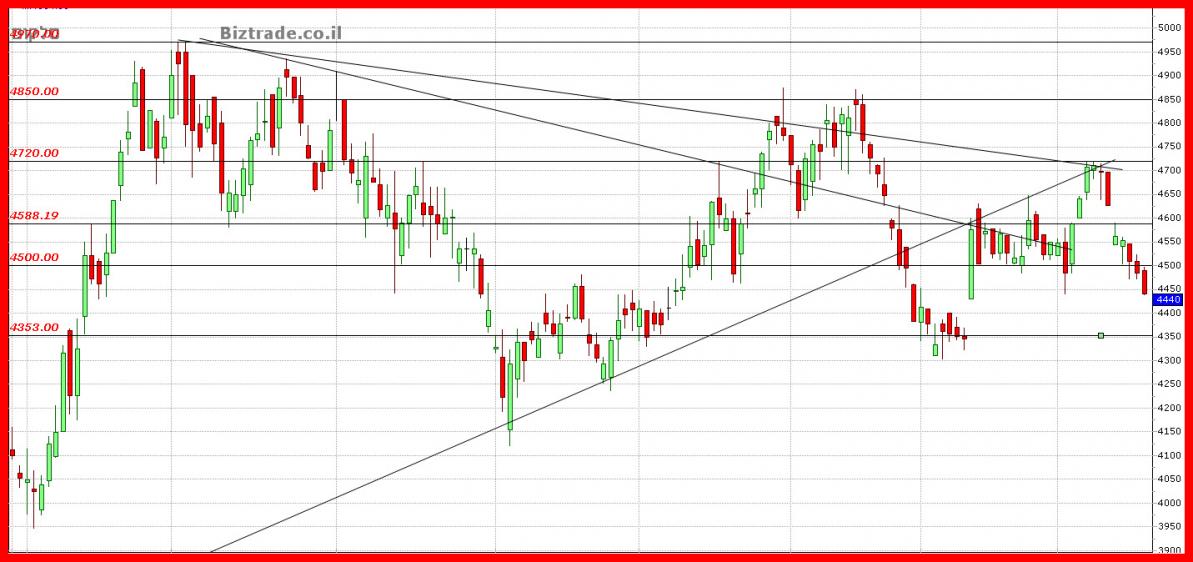 במידה וה 4450 לא יפרץ מיד ביום המסחר הבא, הצפי הוא המשך ירידות לתמיכות שנכתבו מעלה.
