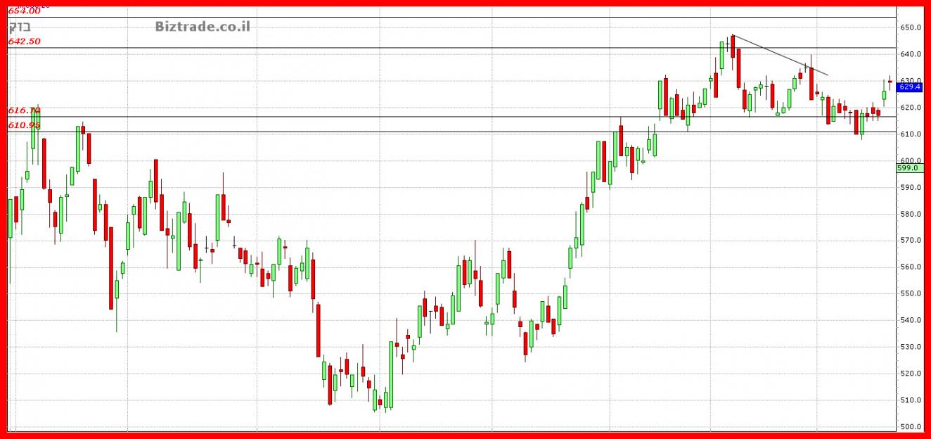 630 הוא קו התנגדות טכני כך שהמשך עליות תלויות בפריצתו.