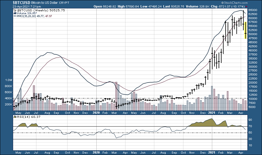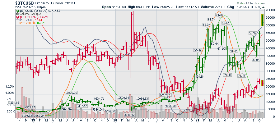המגמה השורית איתנה למרות התנודתיות הגדולה. לביטקוין צמיחה של 156% בשנה האחרונה ו-69% מתחילת השנה 2021. ברמה התלת חודשית היומית נראית תנועת השורט של הגרף. עם שאיפה להתייצבות באיזור ה-51K דולר. בטווח היותר רחוק לגרף השבועי יש מטרה נמוכה באיזור ה-20K דולר אך ברמת התנודתיות הגבוה קשה על פי הניתוח הטכני לראות דברים יותר ברורים