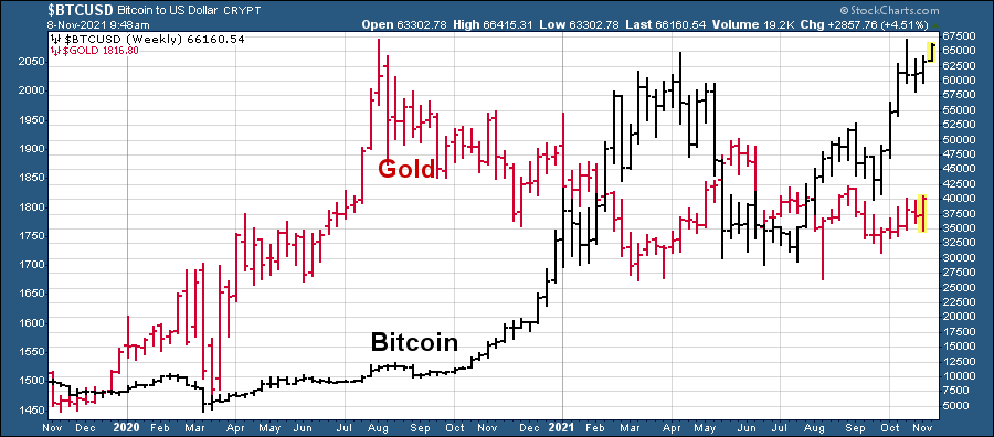 על פי הגרף השבועי הביטקוין (בשחור) ממשיך להוביל צפונה בעוד הזהב במגמת היחלשות (באדום)