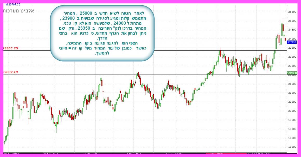 המחיר מגיע לתקרה כפולה ב 23400 ו/שם הוא מסיים את השבוע , כאשר פריצה כן או לא נוכל לדעת רק ביום יומיים הקרובים.