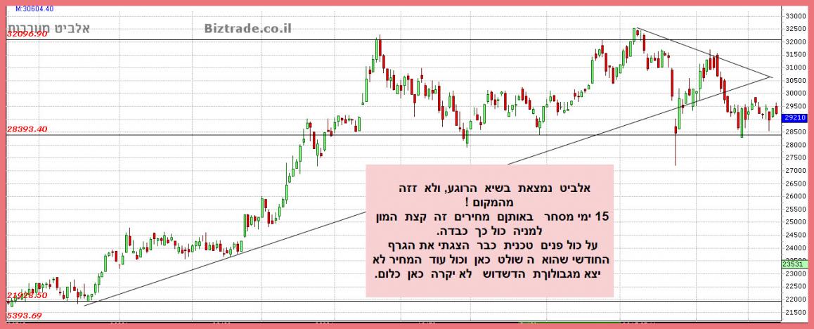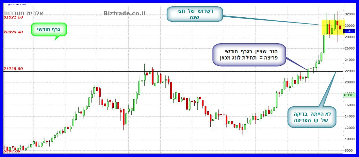 למעשה הטווח החודשי נותן את הדרך להשקעה כי הוא בנוי על החלטות לטווח הארוך מאוד, ומה שניתן לראות בגרף שלאלביט מערכות היום , שהיא יממה לפני תום הנר החודשי הוא ......