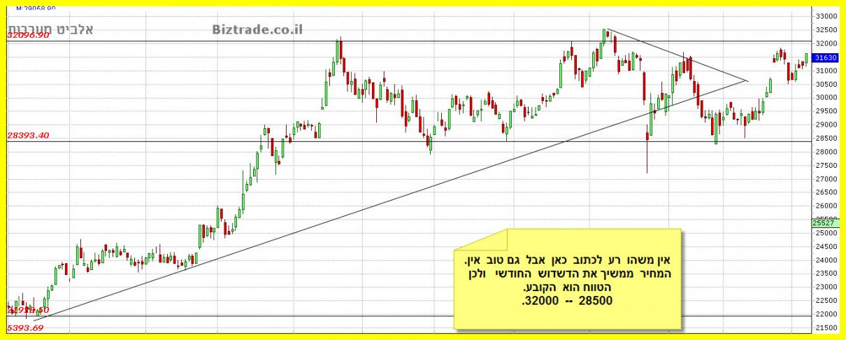 מאז הפריצה של הגבוה אי פעם ב 22000 ( הכוונה עם סגירה ) , שהתרחשה ב 9-14 המחיר נמצא בעלייה מתמדת במשך 7 חודשים רציפים ללא שבירה של אותה פריצה ואילו בחצי שנה האחרונה ( מחר מסתיים נר נוסף חודשי ) המחיר נמצא בתחום נתון של טווח דשדוש שבין ה 28400 ל 32000 = טווח מסחר סגור של 3600 נק" שהם כ 10% בארך ממחיר המנייה כאשר היו בריחות קטנות מה טווחים מעלה וגם מטה.