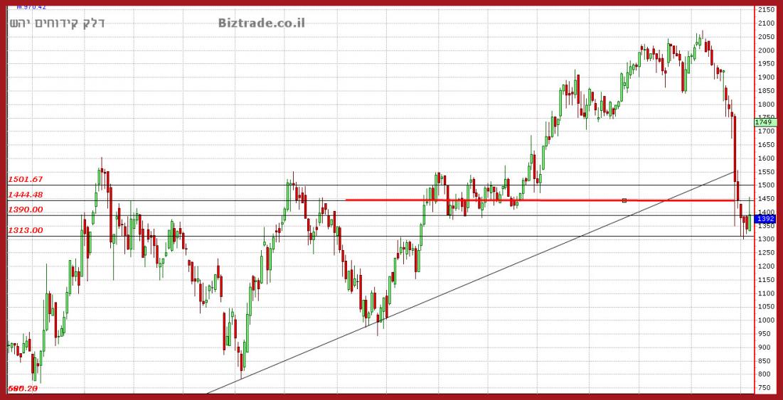 מהסיבה שגרף זה נפגע יותר מאבנר , אז כמובן היחס למקום טכני " בטוח " לכניסה ( בטוח יחסי כמובן ), הוא שונה, ועל כן אין מה להמתין כאן לפריצה של קו מגמה עולה אלא בהחלט מספיק כול סגירה ביומי + בשבועי של קו ה 1444, המסומן באדום בגרף. , ופריצה כאן צפוייה להוביל את המחיר ל 1550 , לא מהר אבל זה היעד. כמובן שכול התוכנית העבודה הזו לא תוכל לצאת לפועל ללא שמירה ברורה של השפל ב 1310.