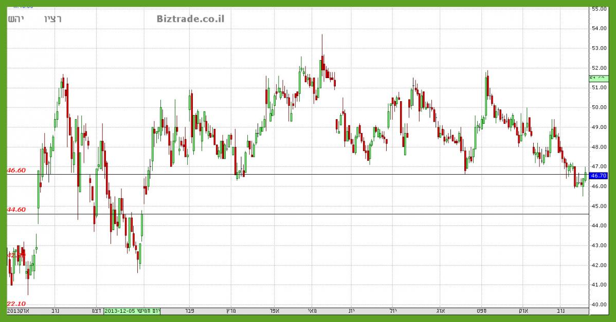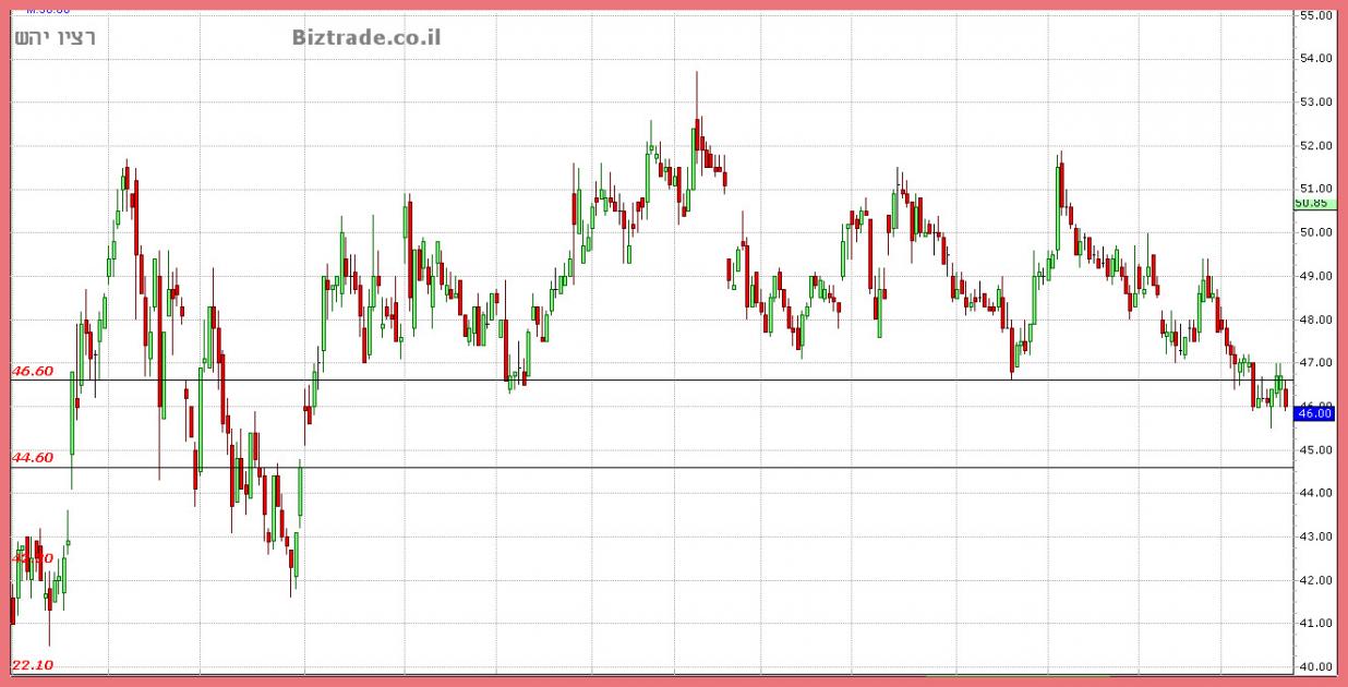 המחיר חוזר לעמדת מוצא קודמת ב 46 כאשר לאחר יומיים התנגדות ב 47נ הוא פותח ביום ה" מתחת ל 46.6 ושם מתנהל כול היום.