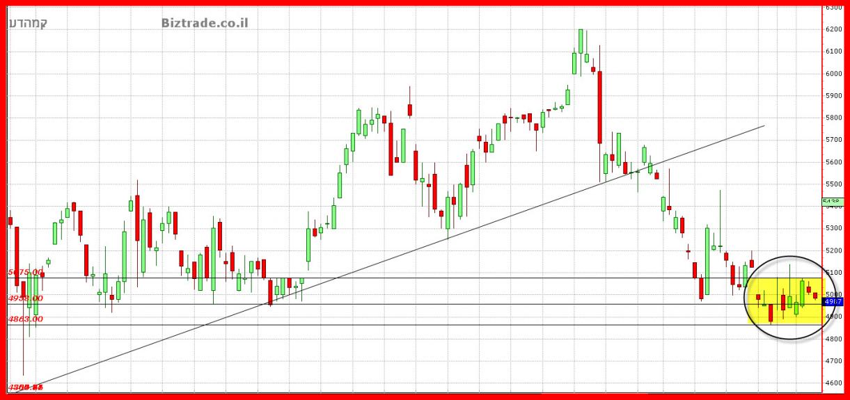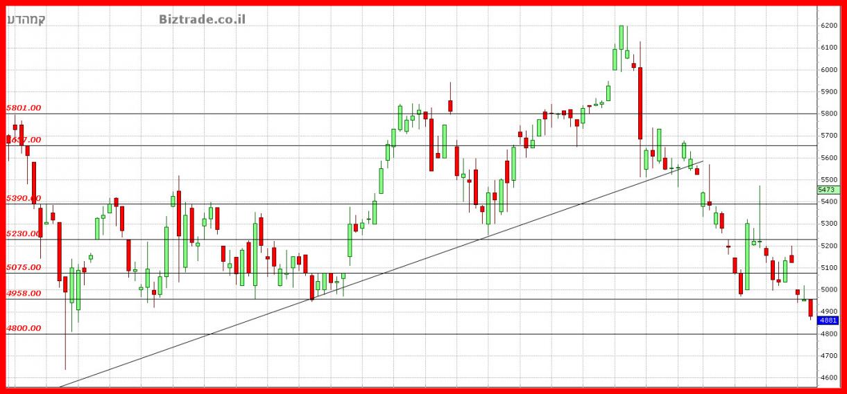 לחץ המוכרים לא פוסק, והים גם התמיכה ב 4960 , נשברת , והמחיר מגיע לסגירה ב4881, כאשר הצפי הוא המשך ירידות בינתיים לתמיכה הקרובה ב 4800.