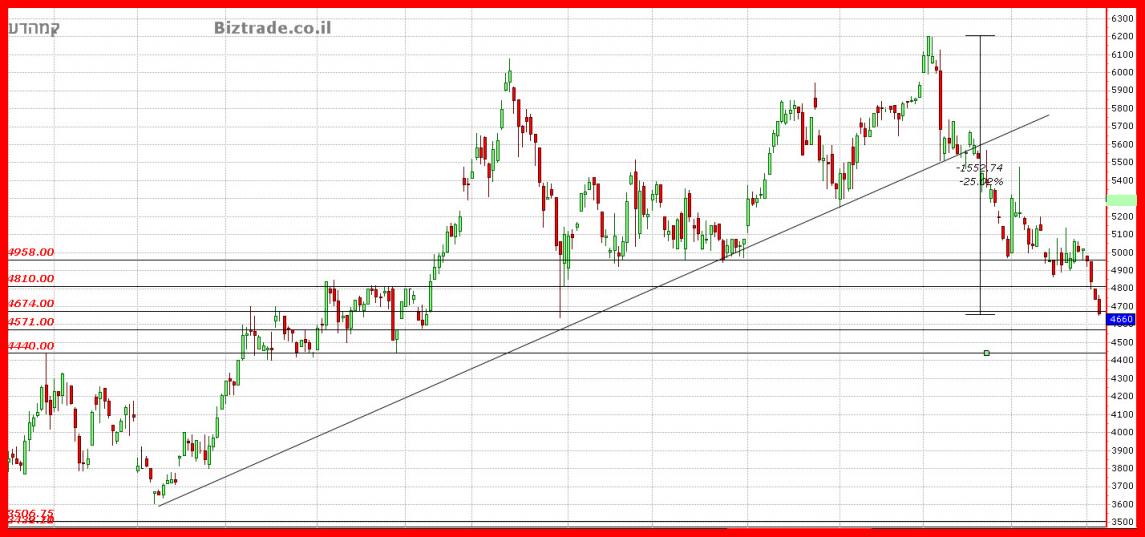 במידה וגם קו זה ישאר בניצחון המוכרים , אזי המחיר צפוי יהיה לרדת לתמיכות ב 4570 -- 4440., כאשר אנו כבר נמצאים בירידות של 25% כרגע.
