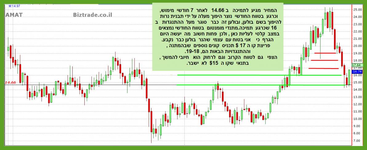 המחיר מסיים את השבוע לאחר שנתמך בשתי תמיכות טכניות שהם תמיכות מהטווח השבועי, על כן הן חשובות יותר, והן ב 27.5$ + 30$. ויחד עם זאת המחיר גם מצליח לסגור השבוע מעל ממוצע 20 החשוב , ומשאיר את הגרף חיובי להמשך.