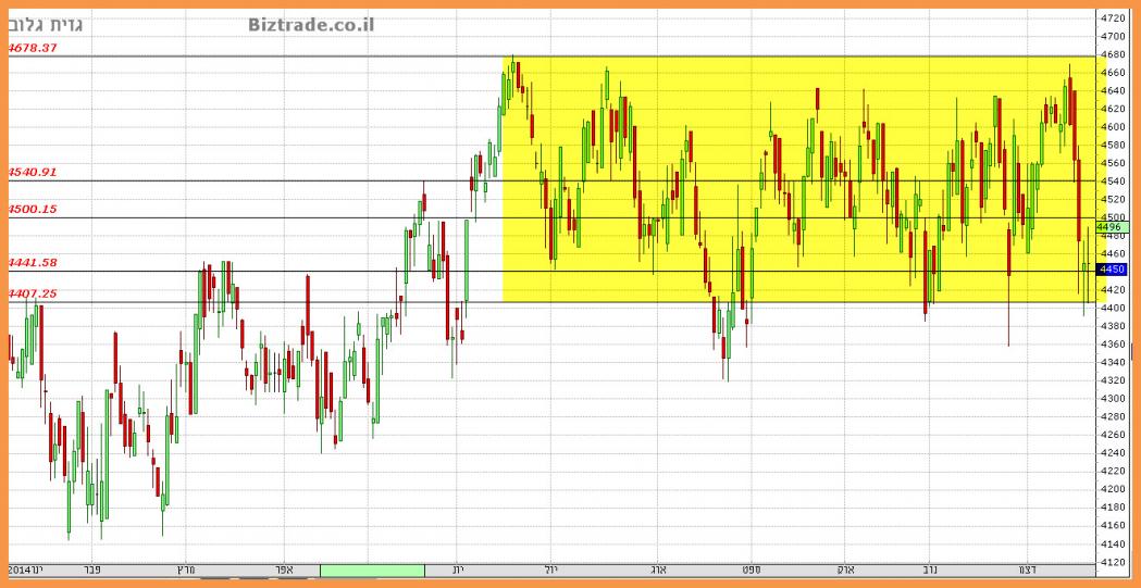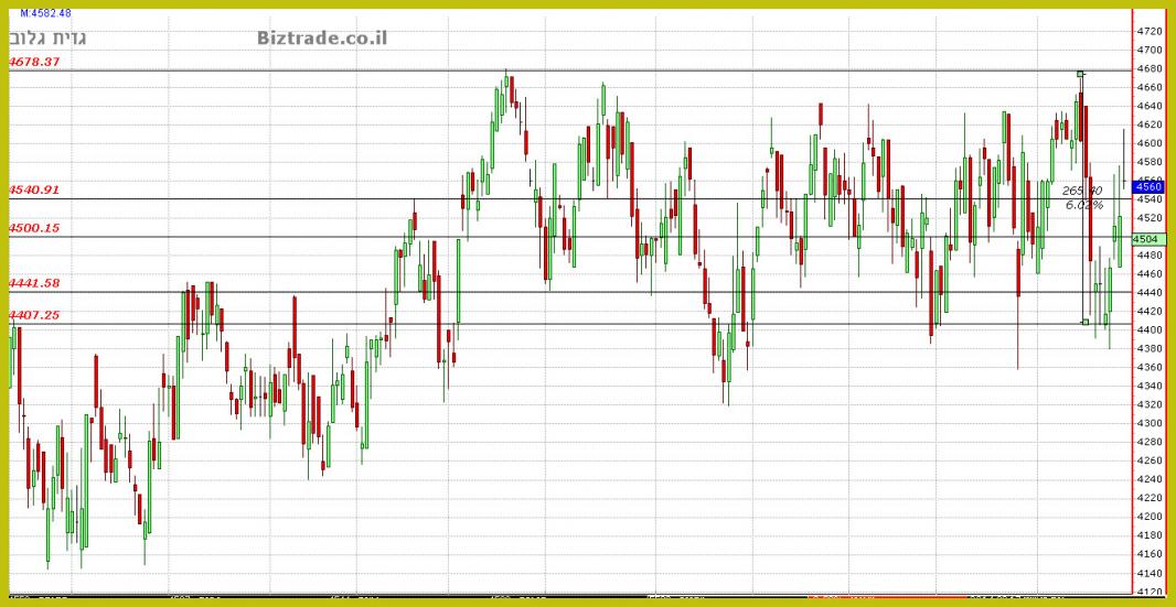 המחיר נמצא בטווח הדשדוש הנצחי , שבין ה 4400 , ל 4680 שהם בסה"כ כ 6%, שכמובן ניתן לעבוד בתוכו.