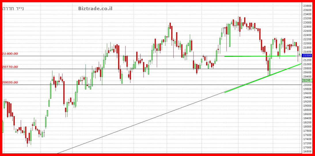 הוא עדיין מצליח להישאר מעל הקו תמיכה ב 21400 , אבל סכנת השבירה לא נעלמה."
