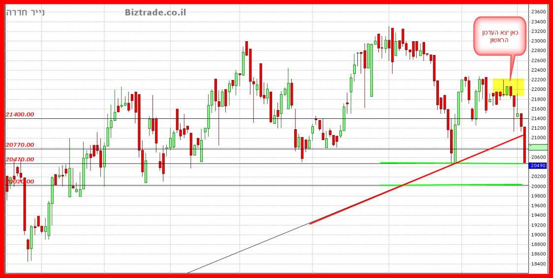 תמיכה טובה קרובה ב 20470 . שבירתה תוביל 20000 , תמיכה ב 20470 יכול להחזיר את המחיר לקו המגמה, לא לפריצתו אלא לבדיקה בלבד.