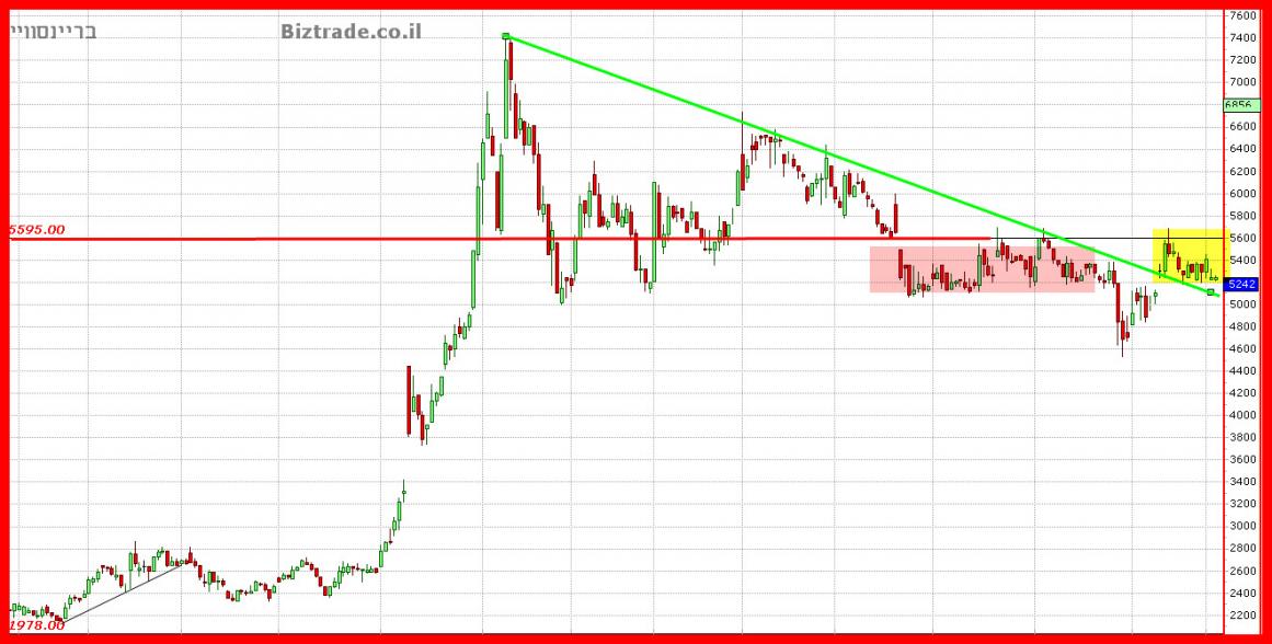המחיר נסחר בדשדוש ימינה אבל בצורה חיובית, כי הוא מתנהל מעל קו מגמה יורד , מסומן במרקר צהוב, ולהבדיל מלפני מספר חודשים , עם אותה התנהלות אבל מתחת לקו מגמה יורד - מסומן במרקר ורוד., ובמשך אותם חודשים של הדשדוש , ברור לכולם שמאז שקו ה 5600 נשבר מטה , המחיר לא הצליחה לפרוץ אותו עד היום וזה כולל 4 התקפות ישירות לקו זה..