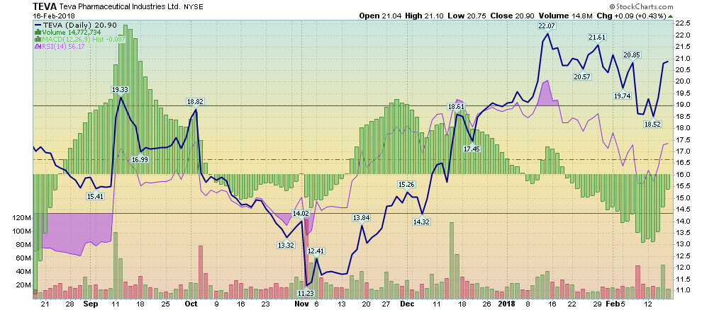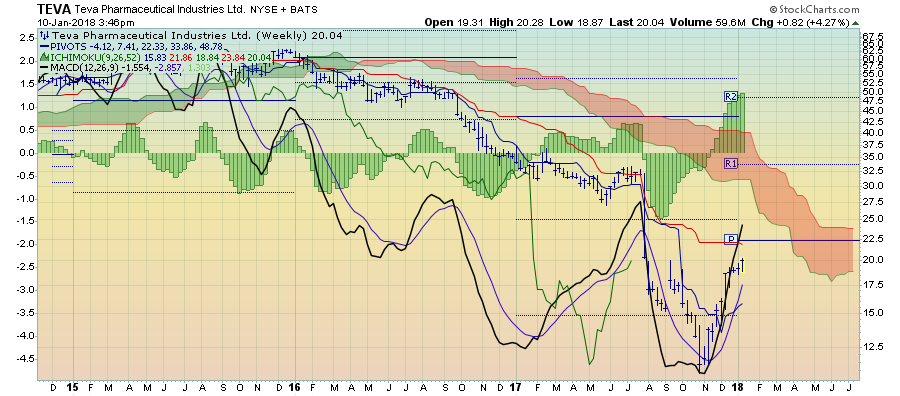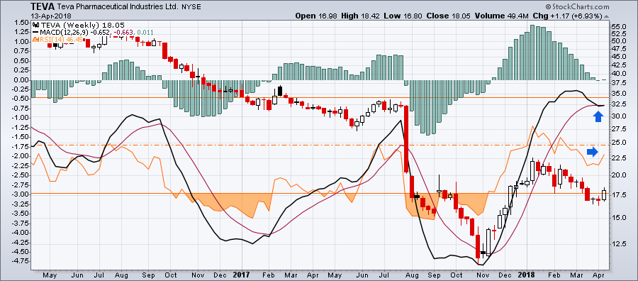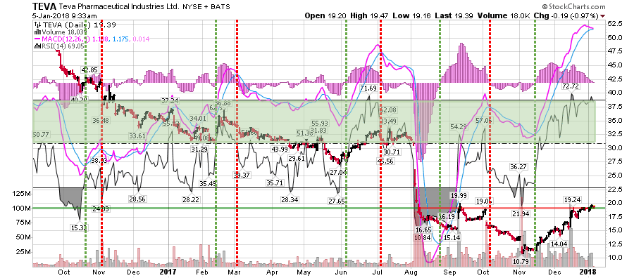 במתנד היומי מתנד ה-RSI נע בגזרת הלונג ובמתנד ה-MACD ניכרת התכנסות לקראת מעבר משיאים לשפלים. בימי המסחר האחרונים נפרצה ההתנגדות שמעל שער 19 דולר ונוצרה תבנית הגיונית להמשך הצומח שכעת מכוון להיפוך באיזור ה-23 דולר. בקווים האנכיים הירוקים בגרף סימנתי את המיקומים בהם החלה צמיחה ובאדומים כשהחלה נסיגה.