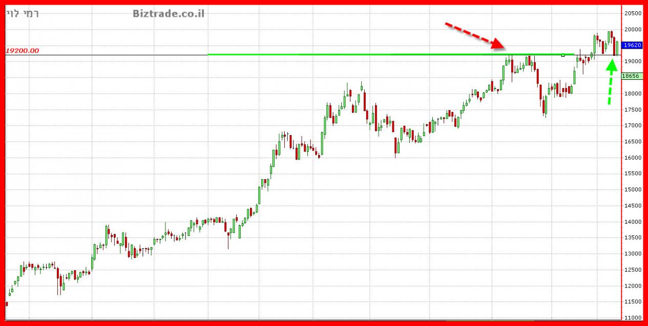 1- היא בהמהלך יורד טכני ועל כן ישנה סכנה ש התמיכה ב 19200 תישבר, אבל הנר החיובי האחרון מרחיק את הסכנה והופך את המסחר הבא ל " צפי חיובי " .