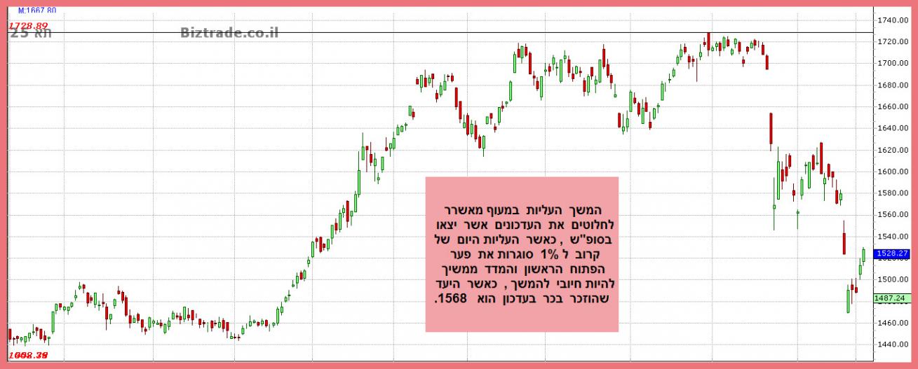 המדד נמצא במגמת עלייה מאז ה קו ב 1044 , ומרגע הפריצה של קו ה 1360 הוא המשיך בעלייתו לקראת אותו שיא השיאים ב 1729 בו שהה כ 5 חודשים בתחום שבין ה 1600 -- 1700 , ולפני חודש יצר הגרף תבנית נרות יפנים להיפוך בשם בולען דובי.