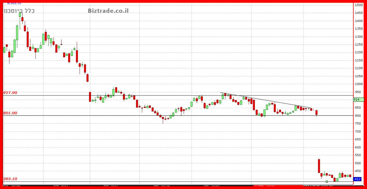 הגרף שומר בינתיים על התחתית ב 383, אבל העובדה שהמחיר לא מתרחק ממנה, משאירה את התחתית בסכנת שבירה נוספת.