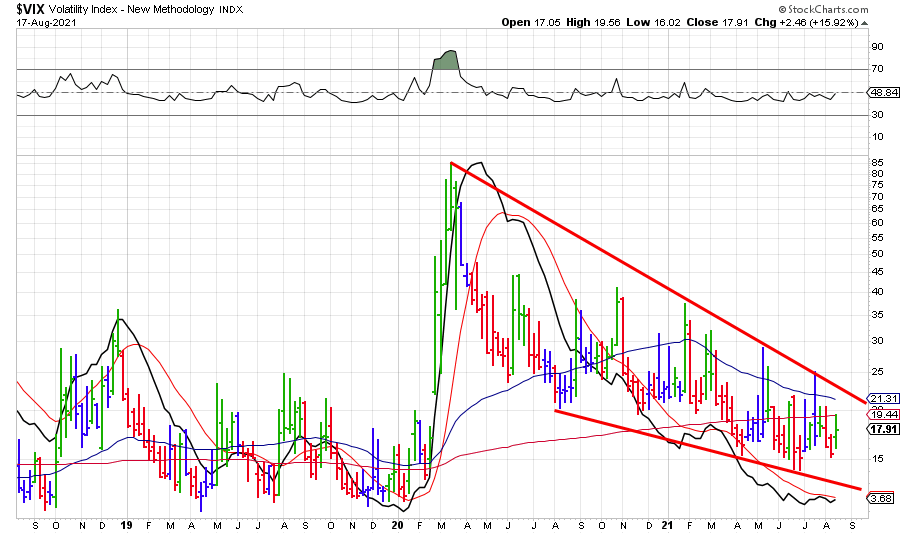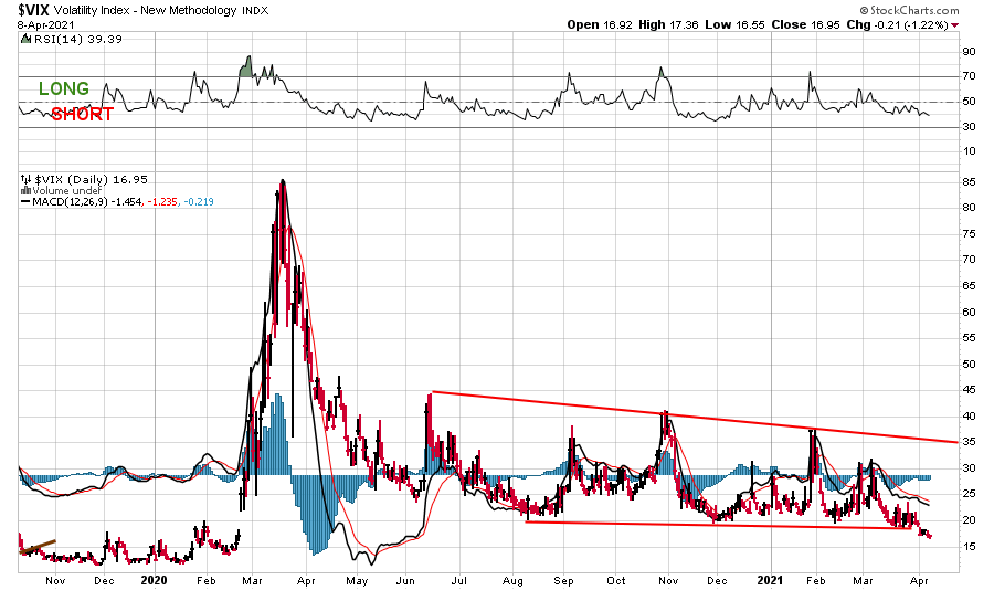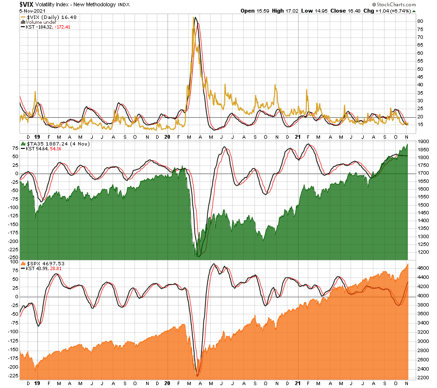 המדד VIX בשורט ומדשדש בעוד ת"א 35 (בירוק) בנסיקה יחד עם המדד האמריקאי (בכתום). מגמת הוויקס בשורט ודובי עם שאיפה לרמת ה-22 נק' מדד.