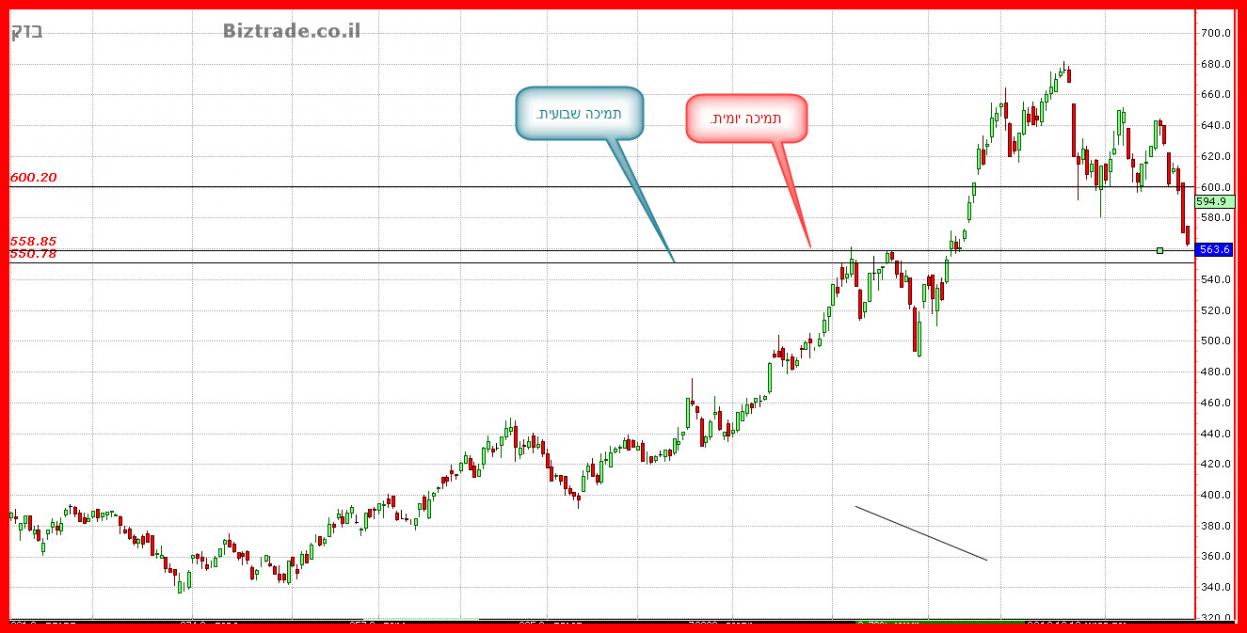 המחיר מתקרב לתמיכה שהייתה יעד מלכתחילה ב 560 בגרף יומי, אבל התמיכה הטובה יותר נמצאת בגרף השבועי ב 550.