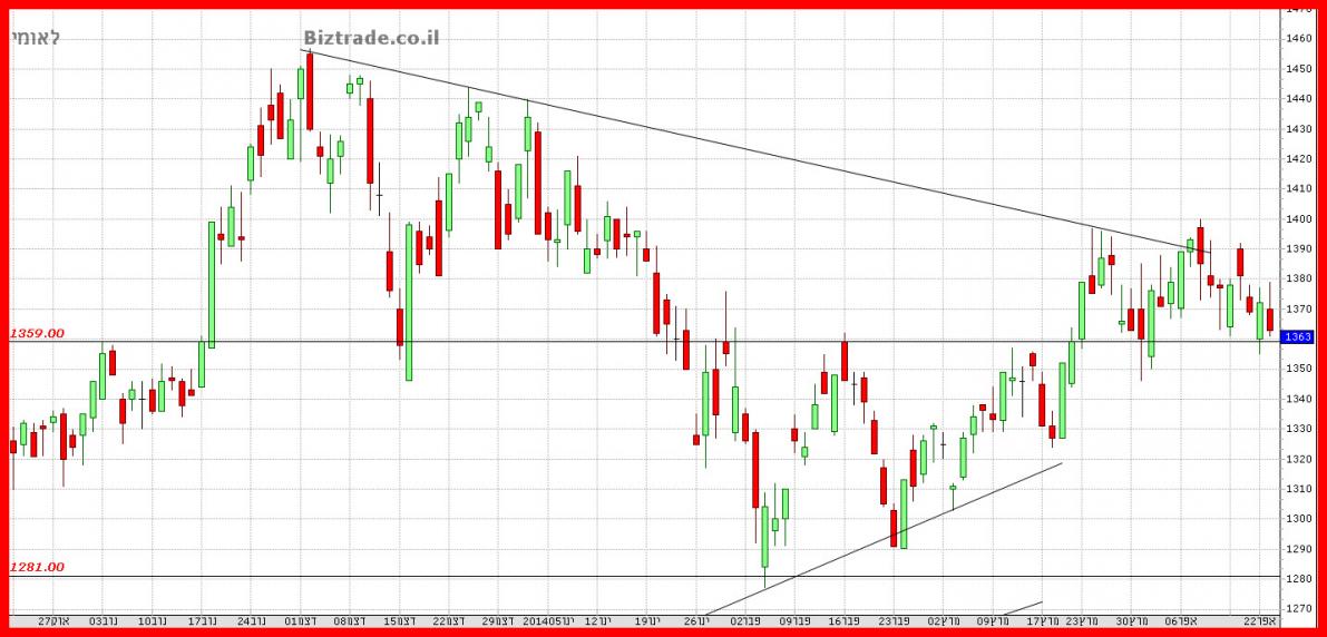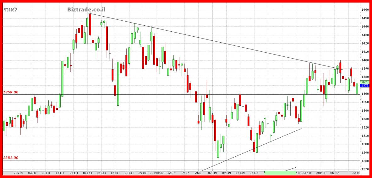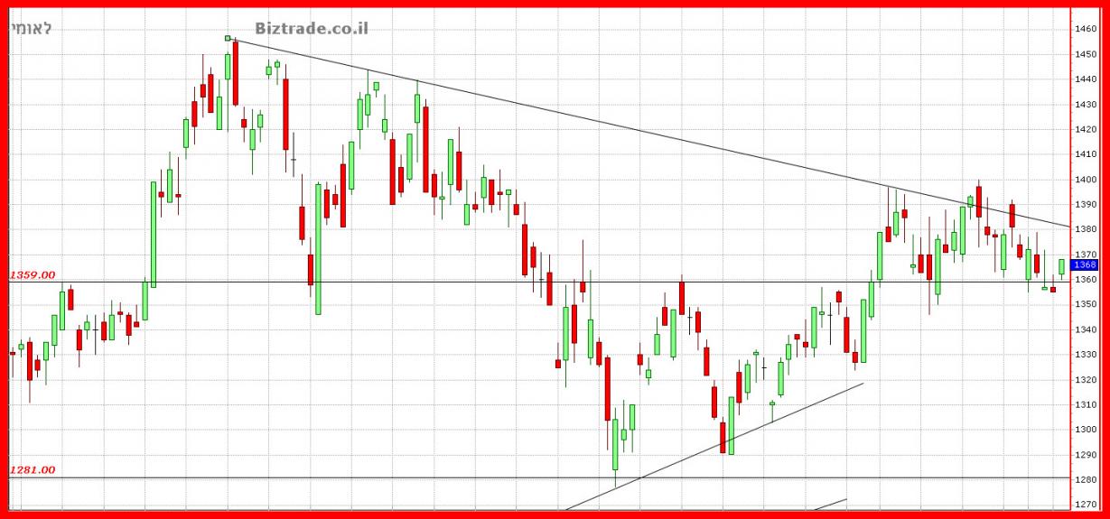 המחיר יורד אתמול לתמיכה ב 1360 וממנו מתרומם שוב, אבל עדיין מתחת לקו ה עיקרי ב 1285.