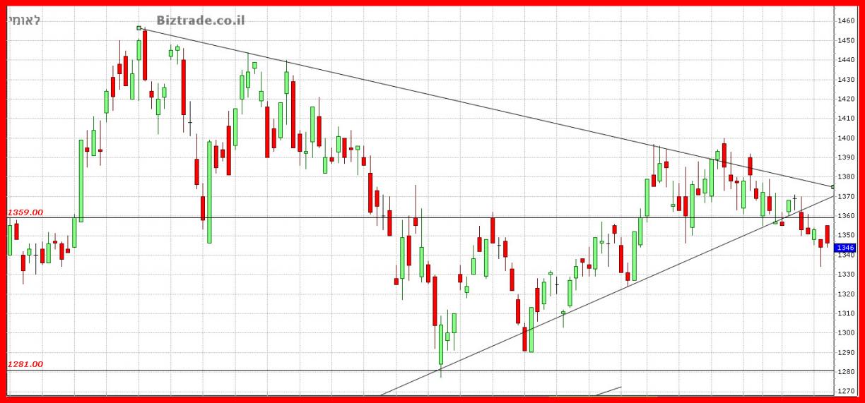 במידה והמחיר לא יחזור מיד מעל ה 1360 וכבר ביום א" הקרוב, הוא צפוי יהיה לפגוש את הקו ב 1340.