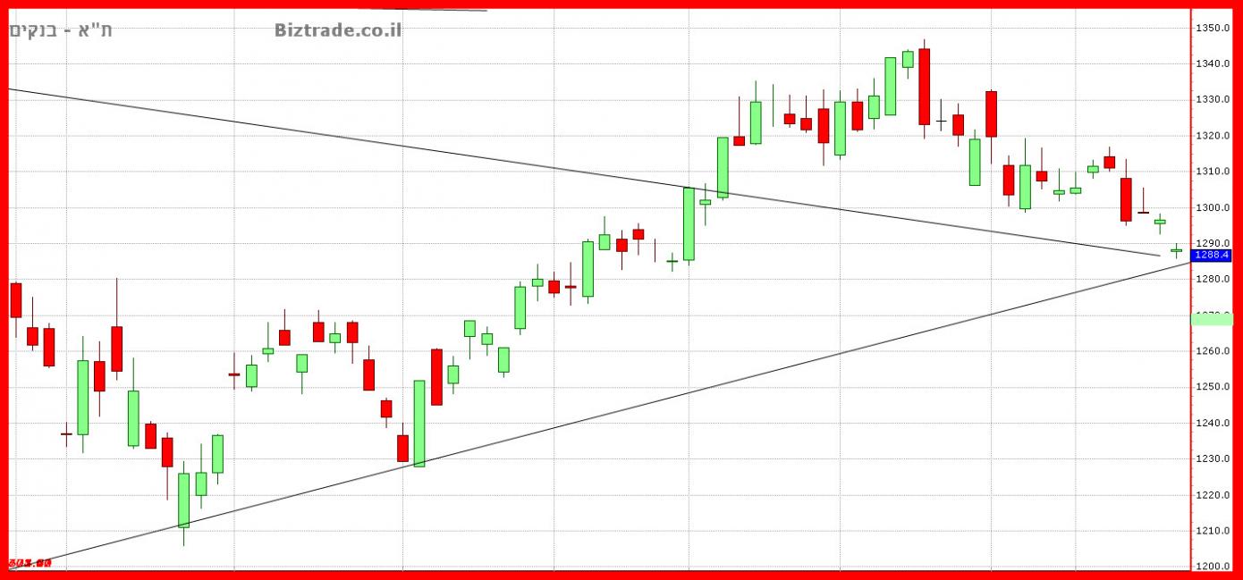 אזור ה 1286, הוא אזור " סופר חשוב, בגרף זה, כאשר נמצאה באותה נקודה הצטלבות , של קו מגמה יורד טווח בינוני , יחד עם קו מגמה עולה ארוך טווח, כך שבמידה וקווים אלא ישברו מצבו של מדד הבנקים הולך להחמיר הרבה יותר.