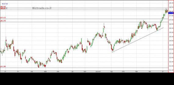 נקודת פריצה היא ב 27$ כך שהיא מעלייה כרגע ב 28.2$ , ולכן כול עוד המחיר מעל ה 27 = חיובי להמשך.