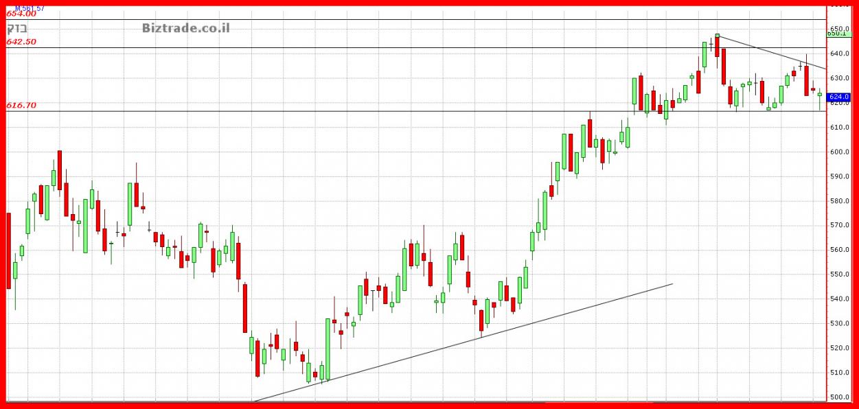 לאחר התנגדות ב קו ה 647, המחיר מתממש, ויורד לתמיכה ב 616,, ועברו כבר כ שלושה שבועות , והמחיר עדיין נתמך על אותו קו ב616 כולל אתמול,
