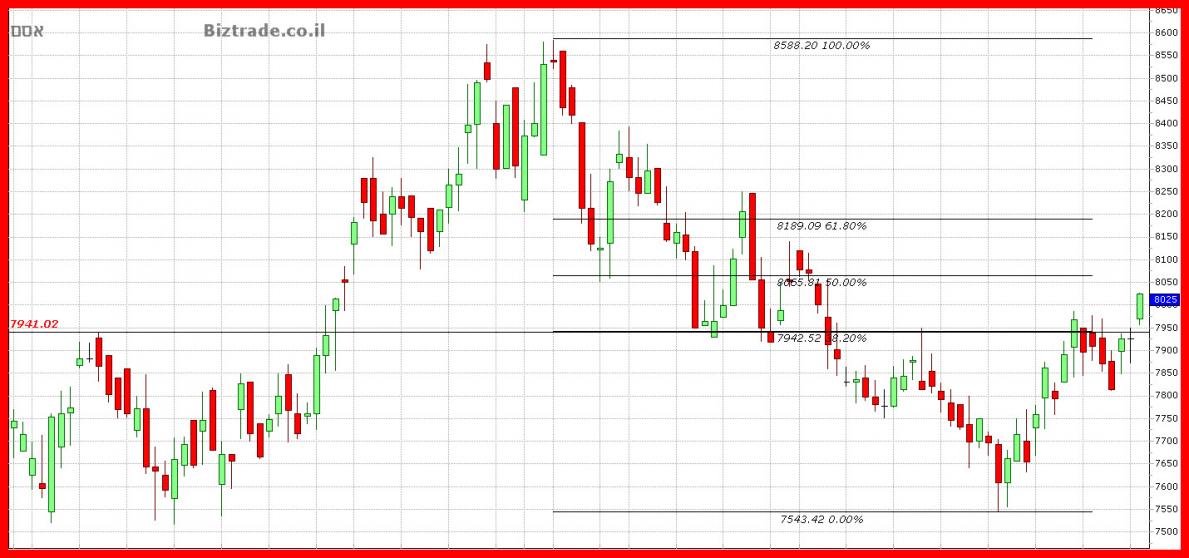 הגרף חיובי כפי שצויין כבר בעדכונים הקודמים והמחיר בדרכו ל 8065 -- 8189 , שהם תיקני פיבו הבאים בתור לאחר פריצת ה 7942 שהיה 38.2% פיבו.