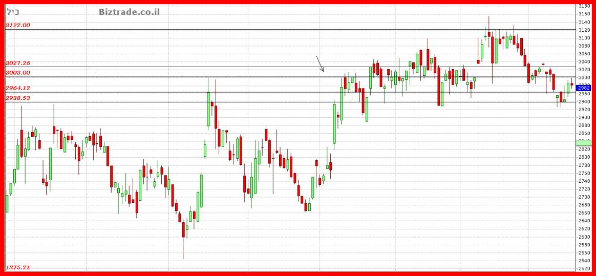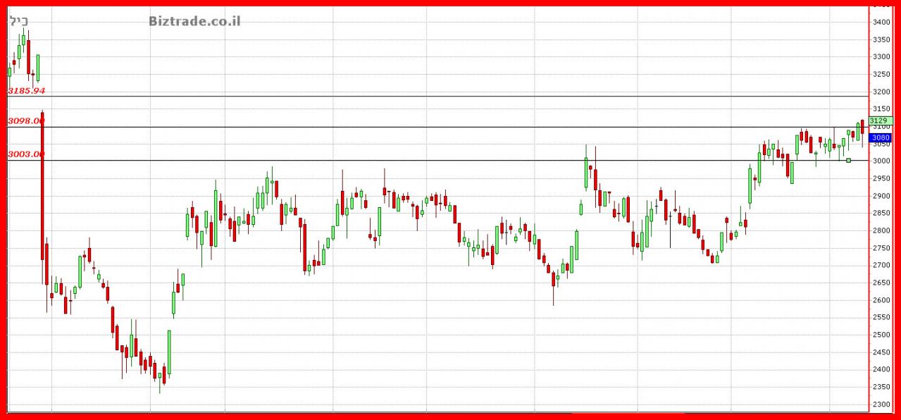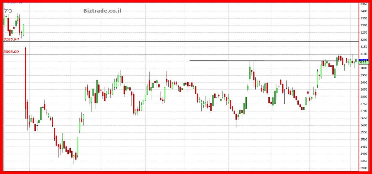 אין עדיין שינוי משמעותי בגרף כאשר אתמול המחיר כן נסגר מעל ה 3050 , אבל עדיין מתחת ל קו הבא.