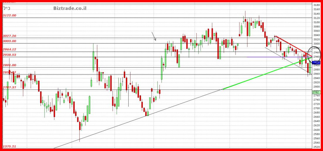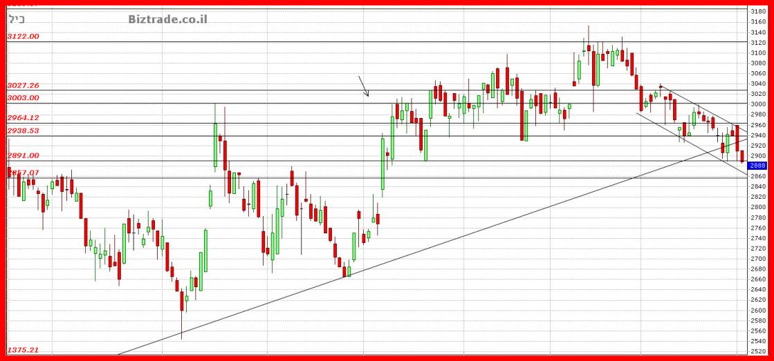 המחיר שבר אתמול את התמיכה ב 2860 , ושבירת הקו של התעלה היורדת יוכל להביא ל 2790.