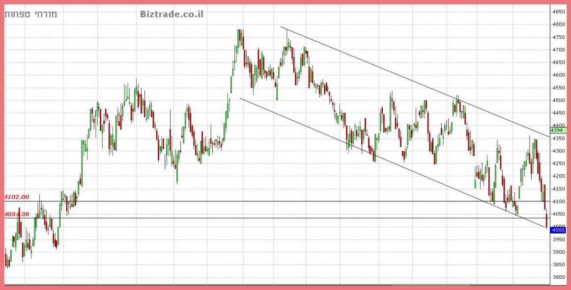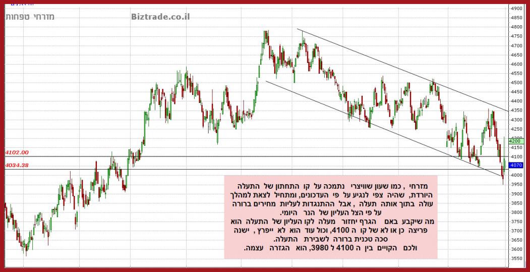 2- המחיר נסחר בתוך תעלה יורדת ולכן כול מהלך עולה מתקן שיגיע ייקח את המחיר לקו העליון ב 4350.